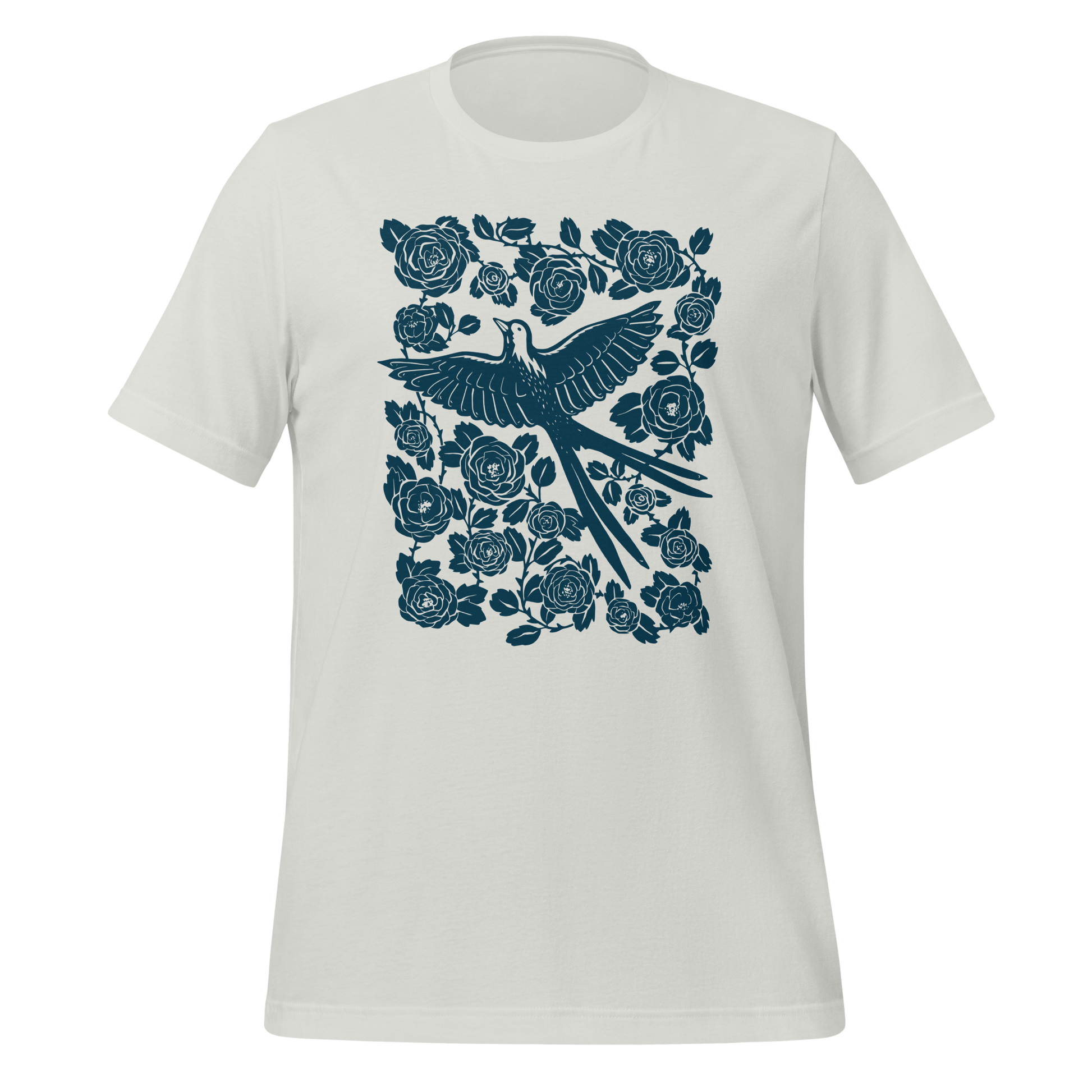 This design pays tribute to Oklahoma's state bird: the Scissor-tailed Flycatcher. The hand-carved aesthetic of the linocut technique brings a timeless, artisanal quality to the design, making it a perfect blend of tradition and modern style. Printed on soft, high-quality fabric cotton, you'll want to wear it on repeat!